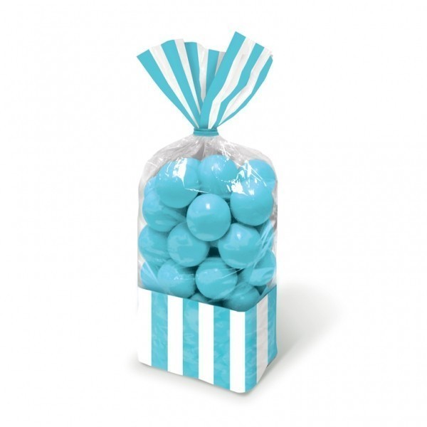 Inspiradas nas antigas lojas de doces, estas bolsas com riscas azuis e brancas são feitas em celofane para mostrarem os saborosos docinhos no seu interior.