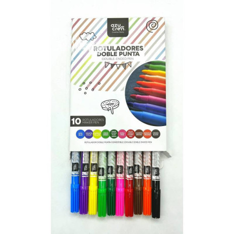 Conjunto de 10 marcadores alimentares Azucren de duas pontas.Cores: azul, roxo, amarelo, verde, verde azulado, fúcsia, verde, castanho, laranja e preto.Ingredientes:E133, E124, E102 Pode conter um efeito adverso sobre a actividade e atenção das crianças.100% comestível - vegetariano - sem glúten. Contém uma pequena quantidade de álcool, que se evapora para deixar a cor fixa.