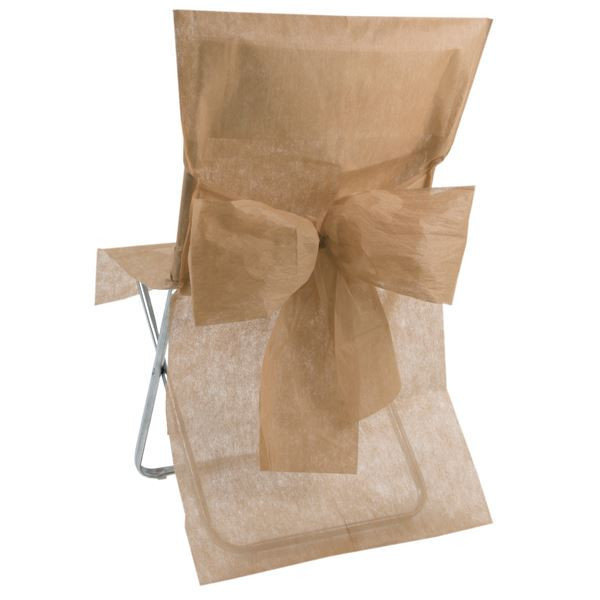 Conjunto de 10 capas cobre cadeiras em poliéster (não tecido) em bege com um laço nas costas. Pode adaptar a qualquer tipo de cadeira sem braços. Muito fácil de colocar. Ideal para decorar festas de casamento, batizados e outros eventos.