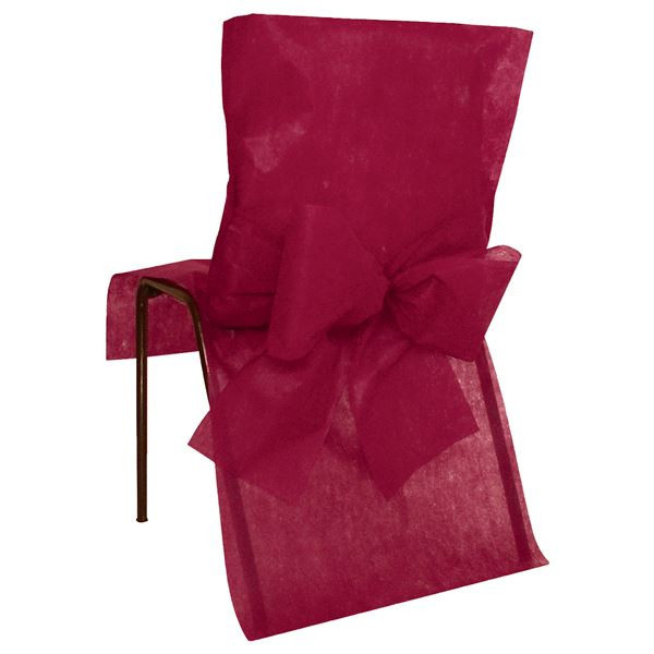 Conjunto de 10 capas cobre cadeiras em poliéster (não tecido) em bordeaux com um laço nas costas. Pode adaptar a qualquer tipo de cadeira sem braços. Muito fácil de colocar. Ideal para decorar festas de casamento, batizados e outros eventos.