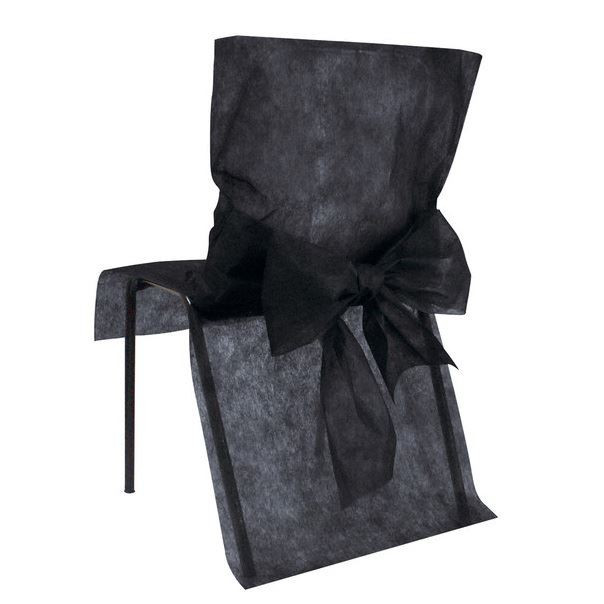 Conjunto de 10 capas cobre cadeiras em poliéster (não tecido) em preto com um laço nas costas. Pode adaptar a qualquer tipo de cadeira sem braços. Muito fácil de colocar. Ideal para decorar festas de casamento, batizados e outros eventos.