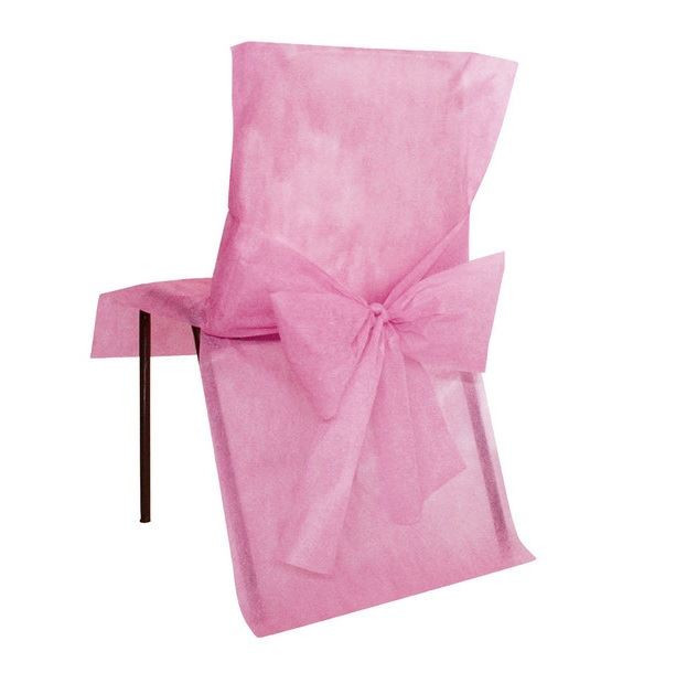 Conjunto de 10 capas cobre cadeiras em poliéster (não tecido) em cor de rosa pastel com um laço nas costas. Pode adaptar a qualquer tipo de cadeira sem braços. Muito fácil de colocar. Ideal para decorar festas de casamento, batizados e outros eventos.