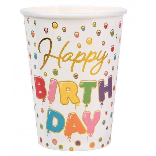 10 copos de papelão branco com uma mensagem divertida e colorida de "Feliz Aniversário" no centro.