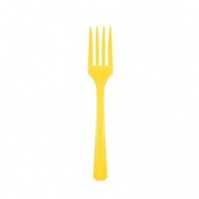Pack de 10 unidades de garfos de plástico na cor amarela. Ideal para festas aniversário.