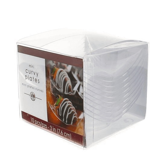 Pack de 10 bandejas plástico transparente de formato curvo. Ideal para servir aperitivos numa festa.