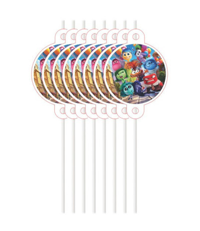 Conjunto de 10 palhinhas de papel com imagem do filme Divertidamente 2 (Inside Out) para decorar a tua festa de aniversário.
