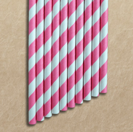 Palhinhas em papel em cor de rosa claro com listas brancas com cerca de 20cm de comprimento.