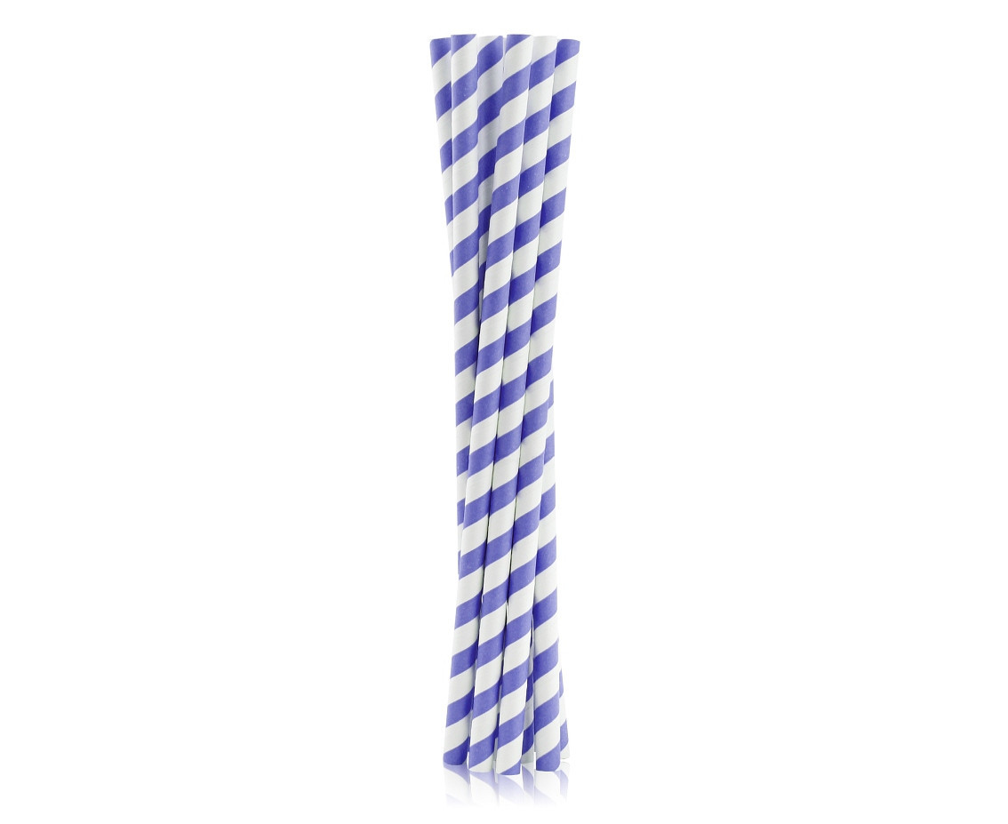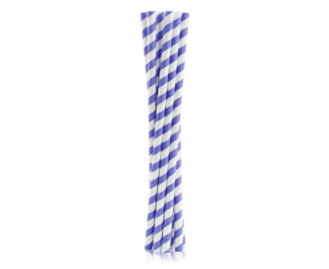 Palhinhas em papel de cor roxa com listas brancas com cerca de 25cm de comprimento.