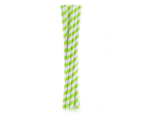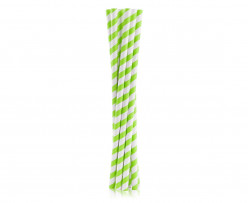 Palhinhas em papel de cor verde com listas brancas com cerca de 25cm de comprimento.