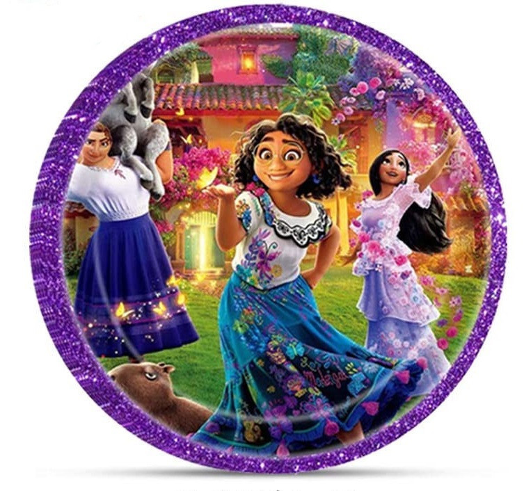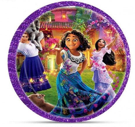 Conjunto de 10 pratos do filme Encanto da Disney, para decorar a tua festa de aniversário com o mesmo tema. A Mirabel e os restantes personagens querem participar na tua festinha.