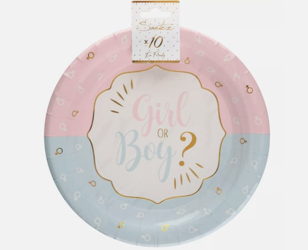Conjunto de 10 pratos de papel descartáveis para chá de revelação de bebé ou festa baby shower, em azul, branco, rosa e dourado.Diâmetro: 23cm