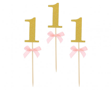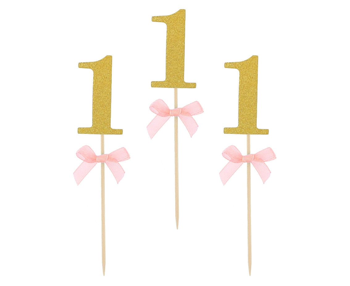 Conjunto de 10 toppers para cupcakes ou para decorar outros elementos para festas de aniversário do primeiro aninho da sua bebé com lacinho cor de rosa com glitter.