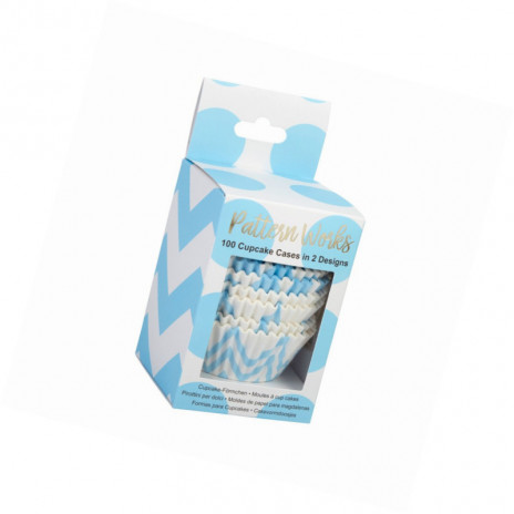 Conjunto de 100 cápsulas de cupcake em papel em azul e branco com dois designs diferentes.