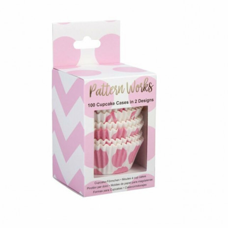 Conjunto de 100 cápsulas de cupcake em papel em rosa e branco com dois designs diferentes.