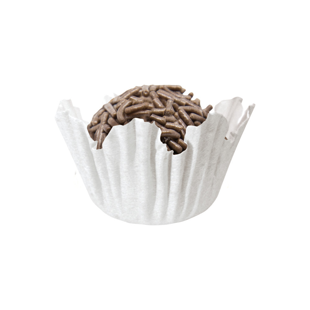 Embalagem com 100 forminhas de papel recortado em branco, perfeito para brigadeiros e outros pequenos doces ou salgados. Vai ao forno e é anti gordura.