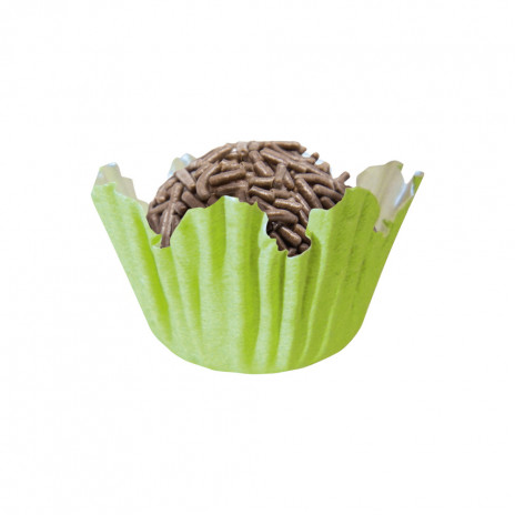 Embalagem com 100 forminhas de papel recortado em verde lima, perfeito para brigadeiros e outros pequenos doces ou salgados. Vai ao forno e é anti gordura.
