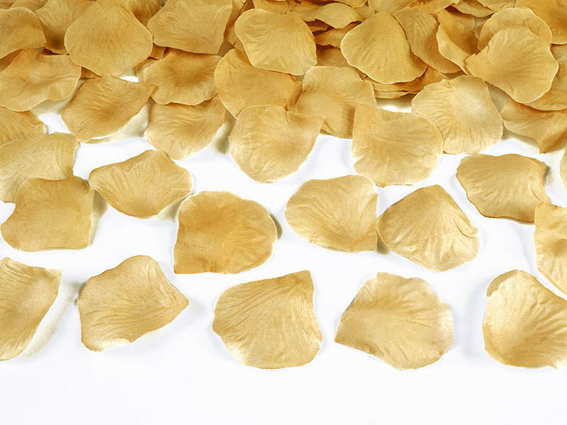 Embalagem com 100 pétalas de cor dourada (ouro) para usar em decoração de festas ou em eventos especiais.