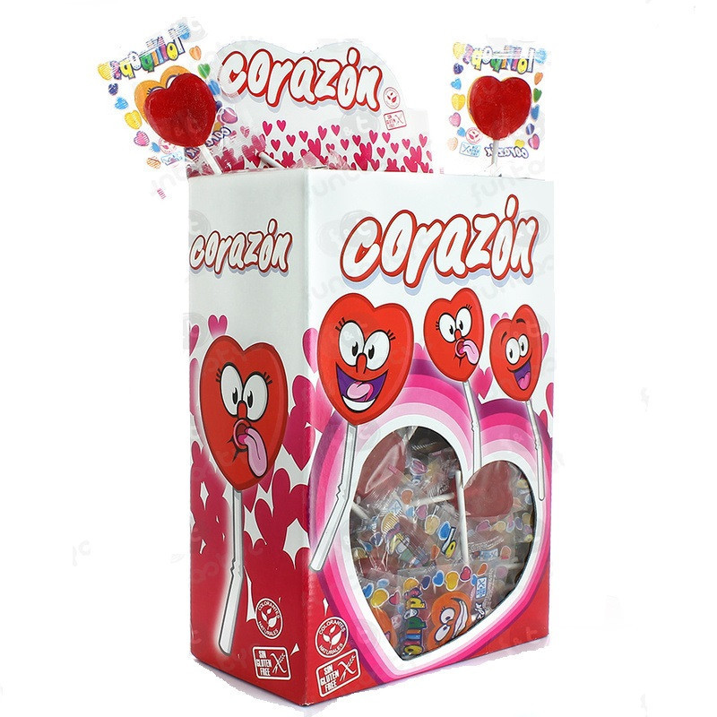 Caixa de 110 chupas de coração em vermelho para brindes ou para deliciar os mais pequenos.
