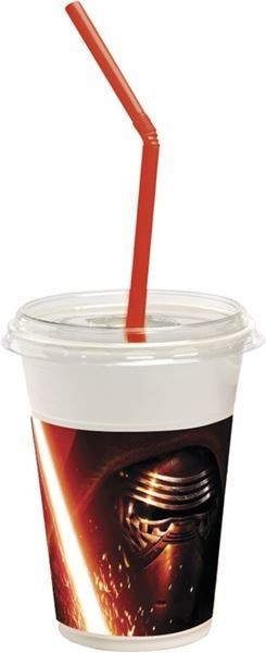 Conjunto de 12 copos de plásticos com tampa de Star Wars, O Despertar da Força com o Kylo Ren para levares para onde quizeres com a sua tampa e palhinha, também pode ser para as ofertas da tua festa de aniversário.