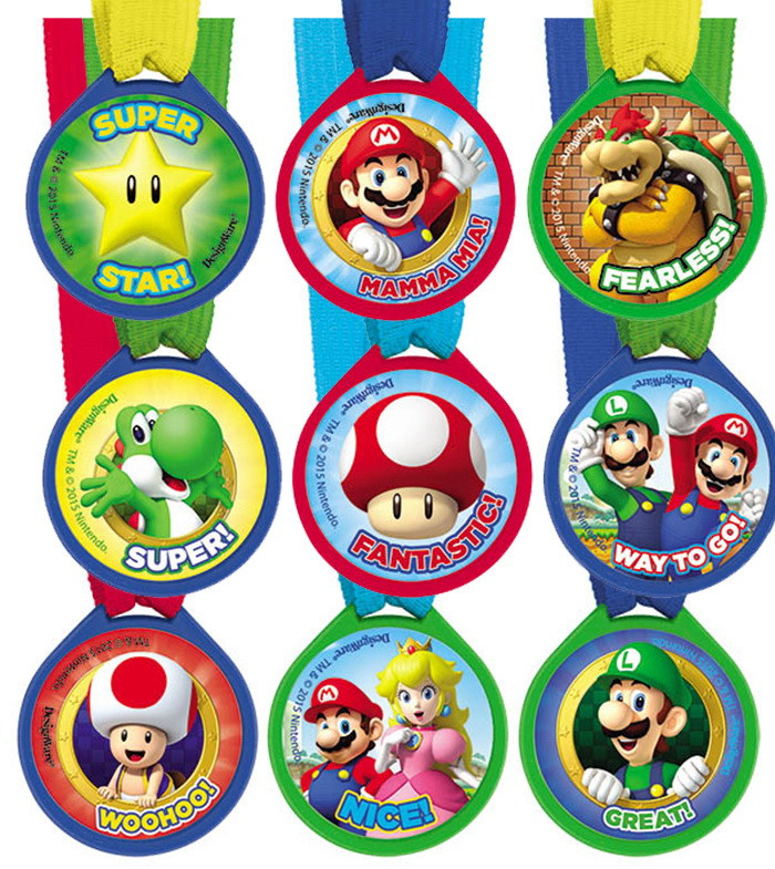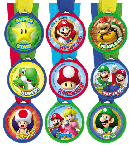 Medalhas de plástico com imagens ilustradas de diferentes personagens do jogo Super Mario em diferentes cores.