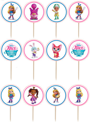 Conjunto de 12 toppers artesanais para cupcakes, doces, fingerfoods ou salgadinhos com imagens sortidas de Alice na sua Maravilhosa Pastelaria. Inclui vários desenhos sortidos.