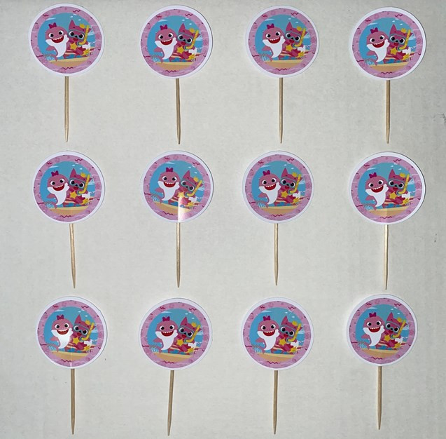 Conjunto de 12 mini toppers artesanais do tema Baby Shark em cor de rosa para cupcakes, salgadinhos ou finger food. Um complemento de decoração ideal para a festa de aniversário.