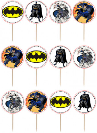 Conjunto de 12 mini toppers artesanais do Batman da DC Comics para cupcakes, salgadinhos ou finger food. Um complemento de decoração ideal para a festa de aniversário.