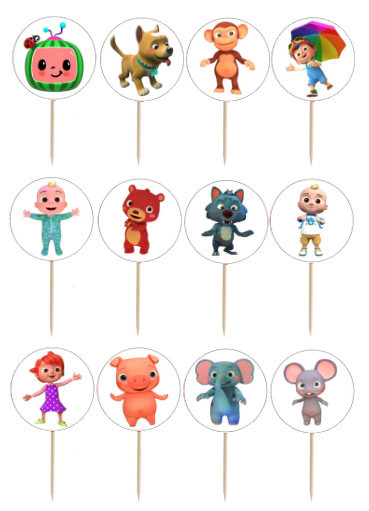 Conjunto de 12 toppers artesanais para cupcakes, doces, fingerfoods ou salgadinhos do Cocomelon.