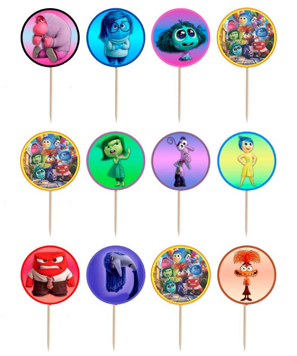 Conjunto de 12 toppers artesanais para cupcakes, doces, fingerfood ou salgadinhos com tema do filme Inside Out. Inclui 5 desenhos sortidos.