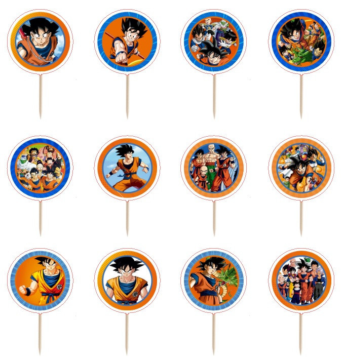 Conjunto de 12 toppers artesanais para cupcakes, doces, fingerfoods ou salgadinhos com imagens sortidas do intemporal tema Dragon Ball.