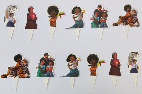 Conjunto de 12 mini toppers para cupcakes, docinhos ou finger food com o tema do filme Encanto da Disney, com a Família Madrigal.