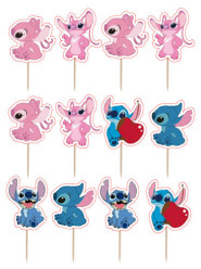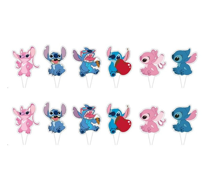 Conjunto de 12 mini toppers para cupcakes, docinhos ou finger food com o tema do Stitch da Disney.