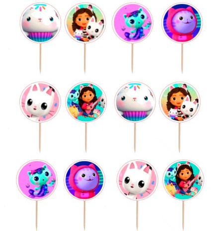 Conjunto de 12 toppers artesanais para cupcakes, doces, fingerfoods ou salgadinhos com imagens sortidas da Casa de Bonecas da Gabby. Inclui 6 desenhos sortidos.