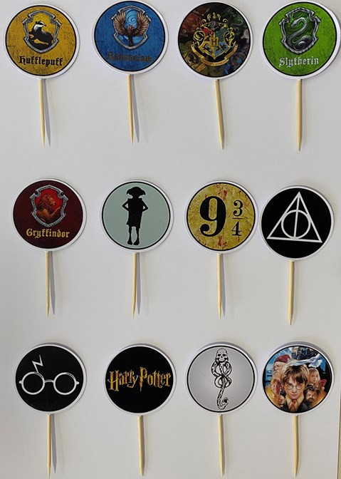 Conjunto de 12 mini toppers artesanais com o tema do Harry Potter para cupcakes, salgadinhos ou finger food. Um complemento de decoração ideal para a festa de aniversário.