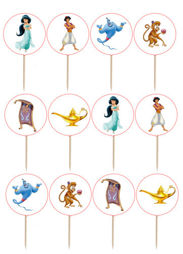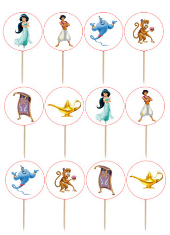 Conjunto de 12 toppers artesanais para cupcakes, doces, fingerfoods ou salgadinhos com imagens sortidas do Aladino e da Jasmine da Disney. Inclui desenhos sortidos.