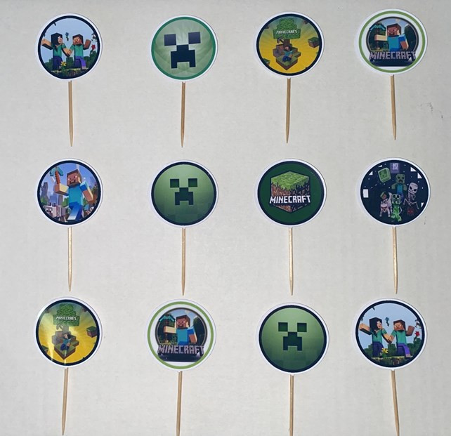 Conjunto de 12 mini toppers artesanais com o tema do jogo Minecraft para cupcakes, salgadinhos ou finger food. Um complemento de decoração ideal para a festa de aniversário.