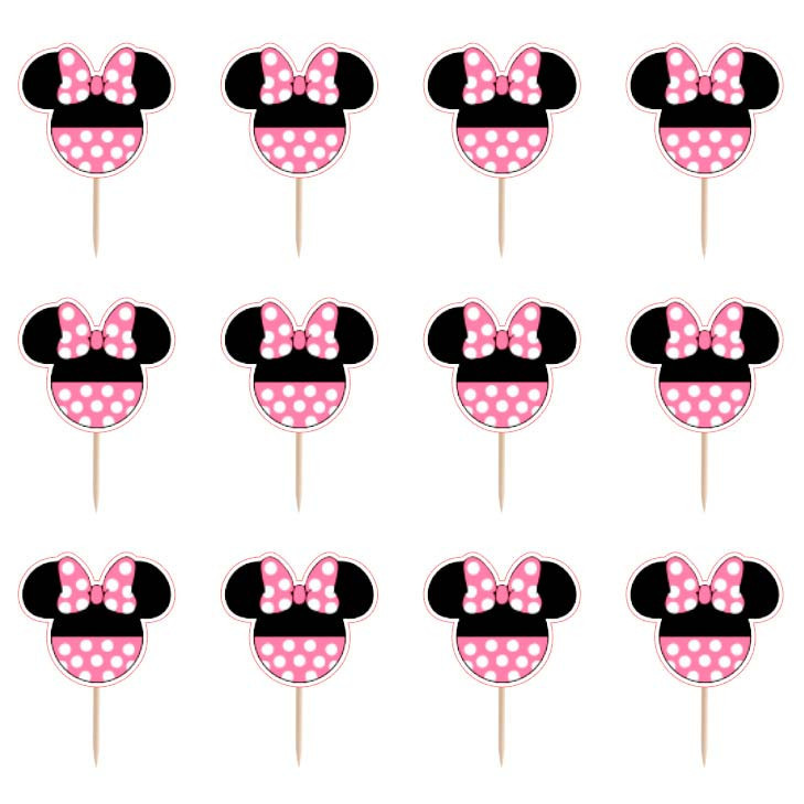 Conjunto de 12 mini toppers em tom vermelho e artesanais para cupcakes, salgadinhos ou finger food. Um complemento de decoração ideal para a festa de aniversário Minnie Mouse.