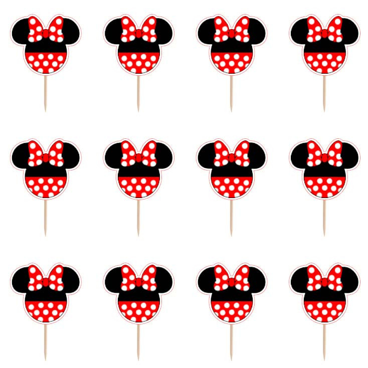 Conjunto de 12 mini toppers em tom preto e vermelho artesanais para cupcakes, salgadinhos ou finger food. Um complemento de decoração ideal para a festa de aniversário Minnie Mouse.