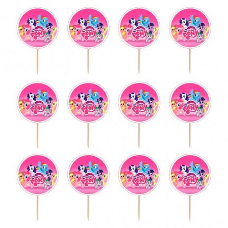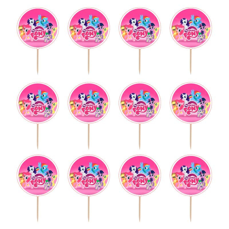 Conjunto de 12 mini toppers artesanais do tema My Little Pony para cupcakes, salgadinhos ou finger food. Um complemento de decoração ideal para a festa de aniversário.