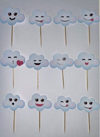 Conjunto de 12 mini toppers artesanais e recortados de nuvens com várias expressões para cupcakes, salgadinhos ou finger food. Um complemento de decoração ideal para a festa de aniversário.