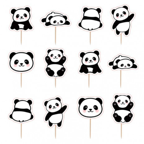 Conjunto de 12 mini toppers artesanais e recortados com 6 imagens sortidas de um adorável Panda para cupcakes, salgadinhos ou finger food. Um complemento de decoração ideal para a festa de aniversário.