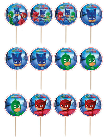 Conjunto de 12 mini toppers artesanais dos PJ Masks para cupcakes, salgadinhos ou finger food. Um complemento de decoração ideal para a festa de aniversário.