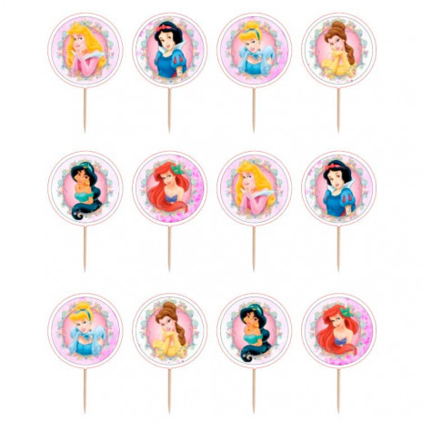 Conjunto de 12 mini toppers artesanais com Princesas Disney para cupcakes, salgadinhos ou finger food. Um complemento de decoração ideal para a festa de aniversário.
