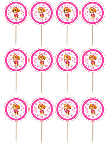 Conjunto de 12 mini toppers artesanais da Skye da Paw Patrol para cupcakes, salgadinhos ou finger food. Um complemento de decoração ideal para a festa de aniversário.