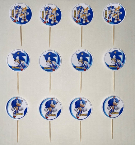 Conjunto de 12 mini toppers artesanais com o tema do jogo Sonic para cupcakes, salgadinhos ou finger food. Um complemento de decoração ideal para a festa de aniversário.