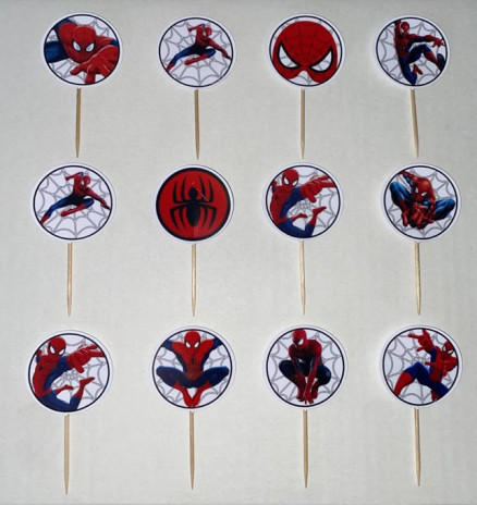 Conjunto de 12 mini toppers artesanais do tema Homem Aranha da Marvel para cupcakes, salgadinhos ou finger food. Um complemento de decoração ideal para a festa de aniversário.