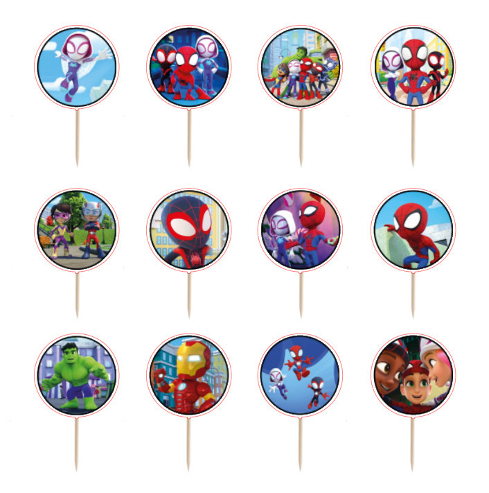 Conjunto de 12 mini toppers artesanais do tema Spidey para cupcakes, salgadinhos ou finger food. Um complemento de decoração ideal para a festa de aniversário.