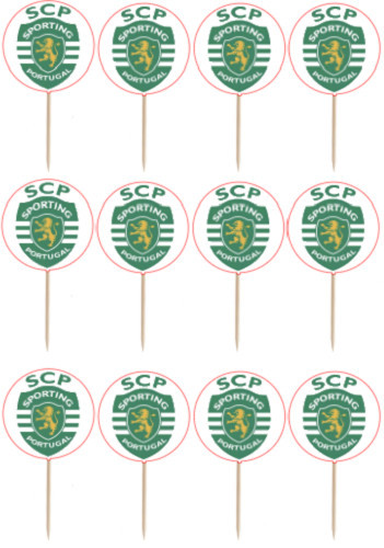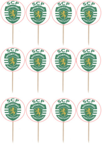 Conjunto de 12 mini toppers artesanais com o tema do Sporting Clube de Portugal para cupcakes, salgadinhos ou finger food. Um complemento de decoração ideal para a festa de aniversário.