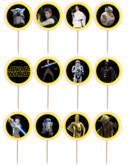 Conjunto de 12 mini toppers artesanais do Star Wars para cupcakes, salgadinhos ou finger food. Um complemento de decoração ideal para a festa de aniversário.