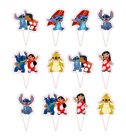 Conjunto de 12 mini toppers para cupcakes, docinhos ou finger food com o tema do Stitch da Disney.